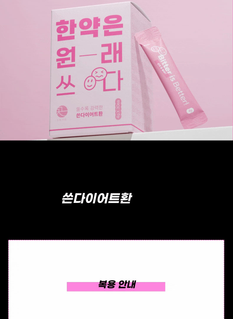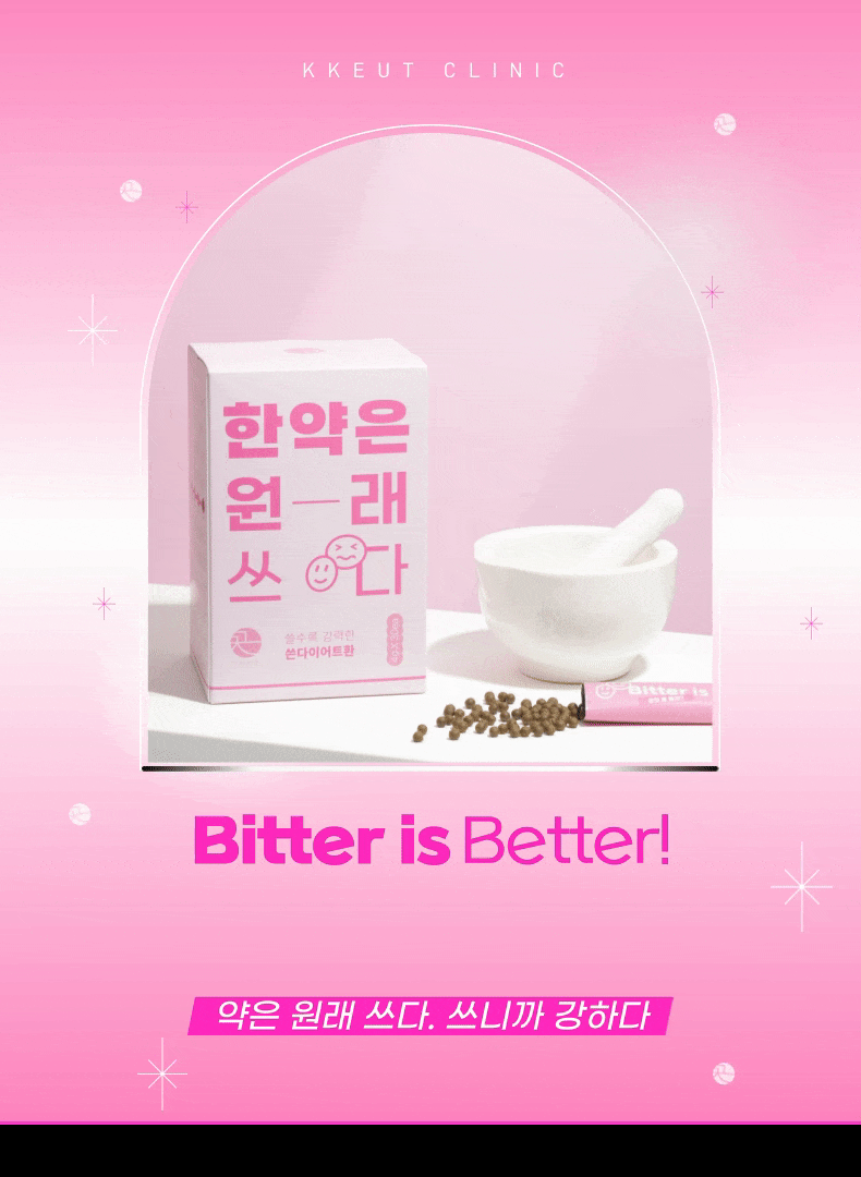 [쎈 다이어트] 쓴 다이어트 환 Bitter is Better! 씁니다. 그래서 쎕니다. 고농도 약재를 밀도 있게 설계한 끗 한의원만의 쓴 다이어트 환! ✔ 기존 다이어트 효과가 아쉬운 분 ✔ 요요 없는 체질 변화 유도를 원하시는 분 ✔ 체지방에 강도 있는 자극을 원하는 분
