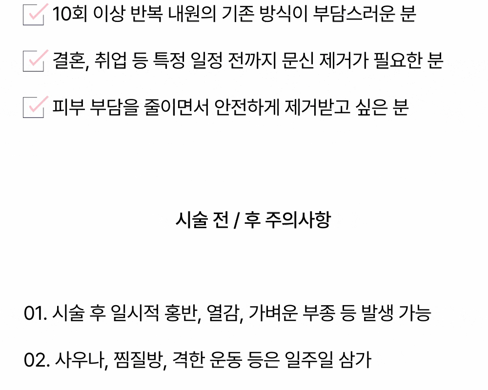 더 이상 1회 시술 후 한 달씩 기다리지 마세요. 한 번 시술로 세 번 받은 효과, 끗 한의원 R0 방식이면 가능합니다. R0 문신제거는 한 번의 내원으로 레이저를 3회 조사하는 방식입니다. 기존 대비 시간도, 횟수도 1/3 수준으로 단축할 수 있습니다. 끗 한의원에서는 끗 한의원은 R0 방식과 자체적인 기포 제거 노하우를 적용해, 한 번 내원에서도 반복 조사가 가능하도록 설계했습니다. 치료 기간은 줄이고, 효과는 그대로 경험할 수 있습니다. *부가세 별도