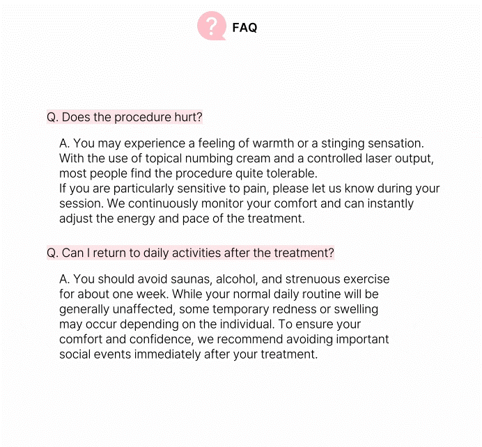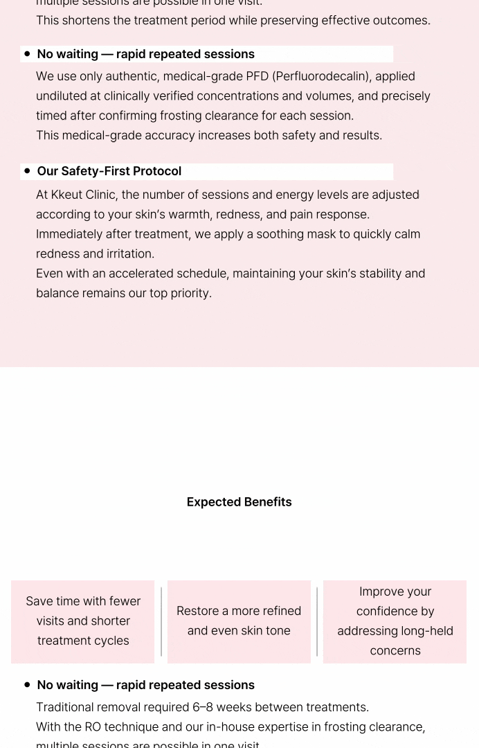 No more waiting a month after just one session. Achieve the effect of three sessions in just one visit with Kkeut Clinic's R0 method. R0 tattoo removal involves applying laser treatment three times in a single visit. Compared to traditional methods, both treatment time and number of visits can be reduced by one-third. Kkeut Clinic applies its R0 method and proprietary bubble removal know-how, designed to allow for repeated laser application in a single visit. You can shorten the treatment period while experiencing the same effectiveness. *VAT separate