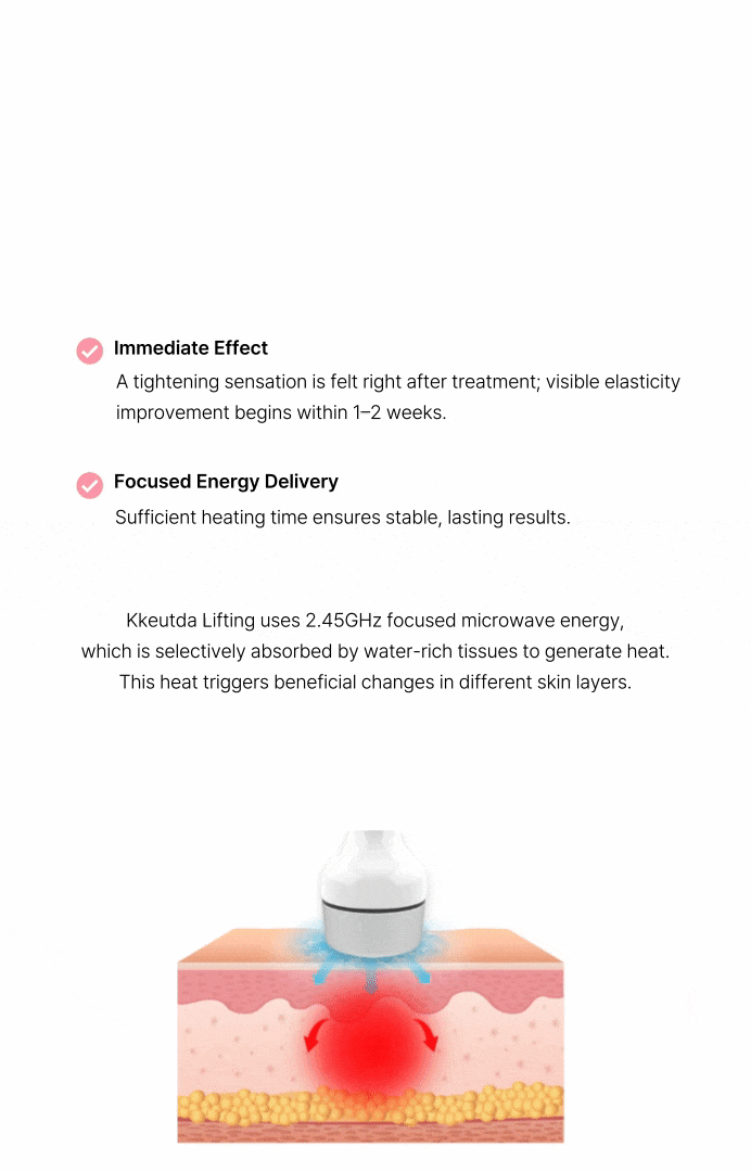 Kkeutdari Lifting is performed with a single 5mm handpiece, but it evenly delivers stimulation to the boundary between the dermis and subcutaneous fat.