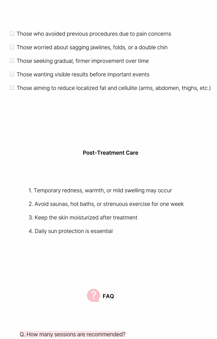 Through this, you can experience bothelasticity improvement and contouring effects simultaneously, allowing for efficient treatment without complicated handpiece changes.