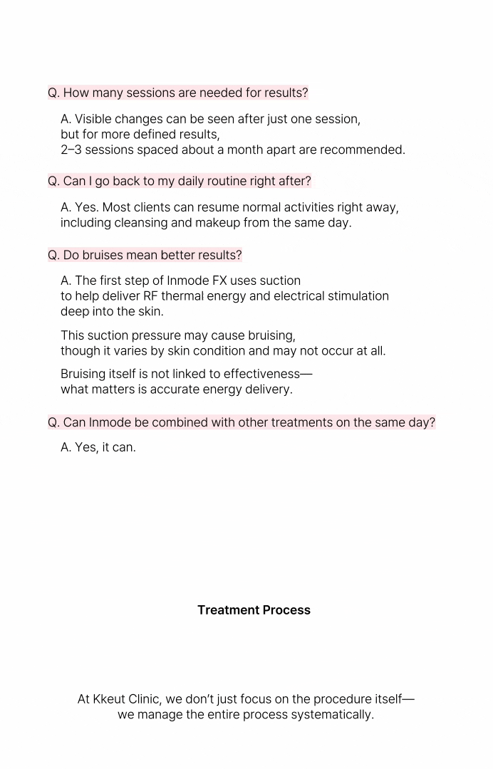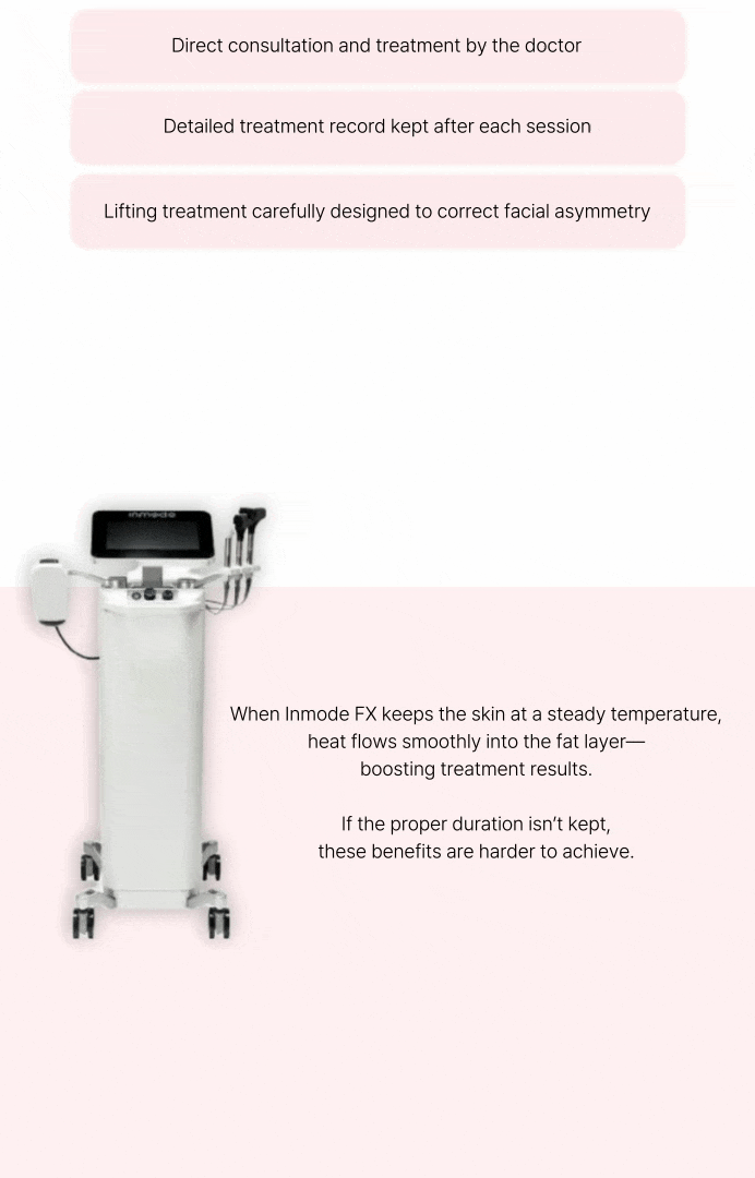 インモード施術過程は合計2段階で、まず全体的に皮膚の真皮層に高周波エネルギーで熱を伝達する段階を行い、その後バキュームで皮膚および不要な脂肪層を集め、高周波エネルギーおよび電気刺激で全体的な輪郭線を改善する過程で構成されます。