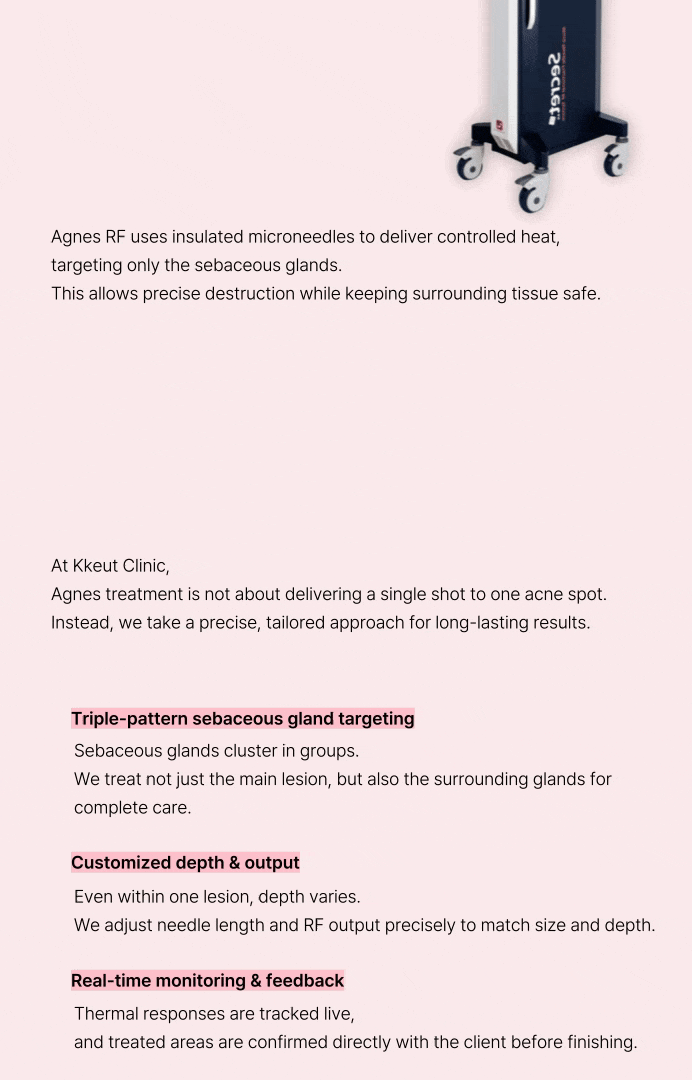 アグネスは「高周波絶縁針(RF insulated needle)」を通じて、皮脂腺、皮下脂肪、病変中心部など原因となる構造物に高周波エネルギーを直接伝達します。高周波(RF)エネルギーは組織抵抗によって熱に変換され、60~70度レベルの局所的な熱を生成します。この熱が皮脂腺や脂肪細胞を凝固させ、該当組織の機能を喪失させ、徐々に吸収または萎縮させます。つまり、単純な「皮脂分泌抑制」ではなく、皮脂腺を物理的に除去する方式で作用し、 再発が少なく、長期的に安定した効果が期待できます。