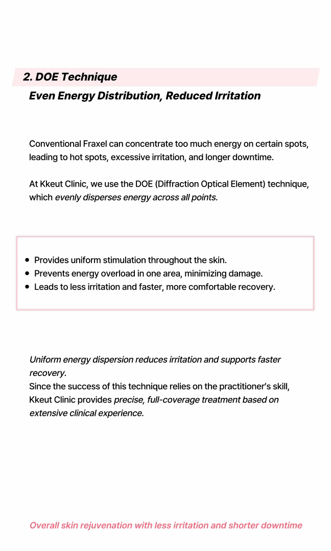これにより、毛穴、小じわ、肌のキメの改善にはDOE方式がさらに有利であり、ニキビ跡のようなケースもオーバーラップテクニックを活用することで十分な効果を得ることができます。