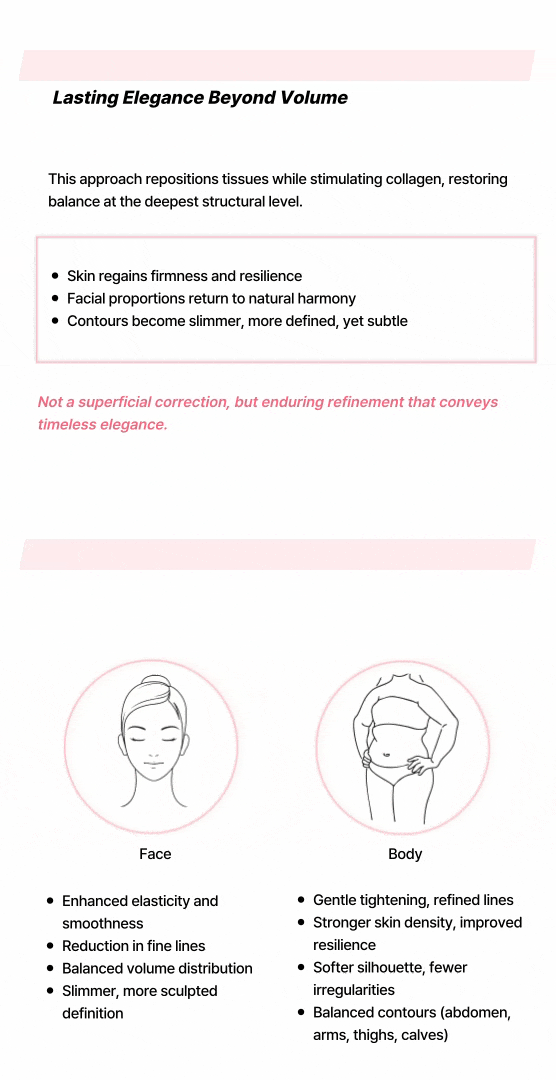 ボディ糸リフティングは、PDO成分で構成された溶ける糸を注入し、タイトニング効果によるサイズ減少、線維化した脂肪を切除することによるセルライト減少効果をもたらします。さらに、糸が溶けることでコラーゲン再生が活発になり、弾力改善効果も期待できます。 * 消費税別途