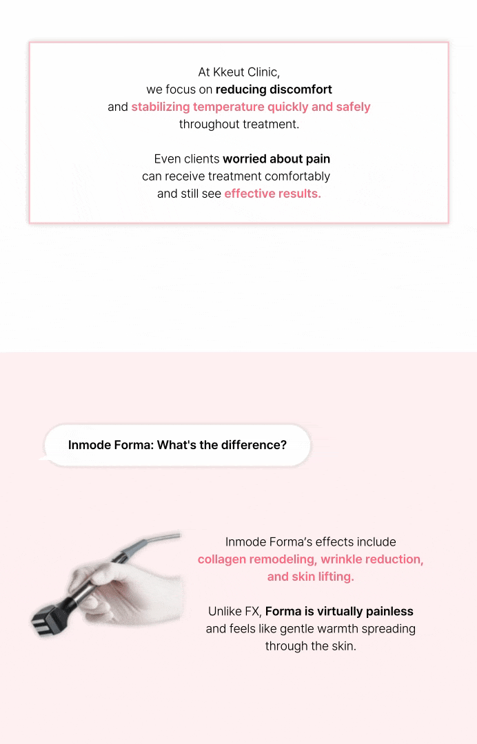 它能将皮肤表面提升至43度,向真皮层传递强大的热能,刺激胶原蛋白生成,有效改善皱纹和增强弹性(第一阶段-Forma)。 通过高能量射频结合IRE技术产生的电刺激,从表皮到SMAS层进行全面部提拉,减少不必要的脂肪,同时再生胶原蛋白,从而改善面部轮廓(第二阶段-miniFx)。