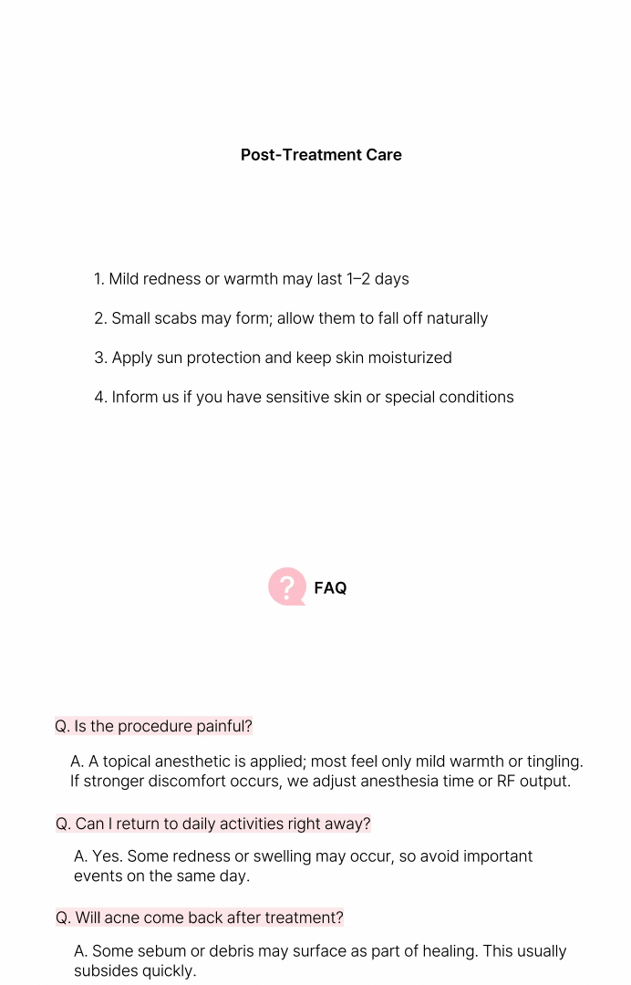Agnes通过“射频绝缘针(RF insulated needle)”将高频能量直接传递到皮脂腺、皮下脂肪、病灶中心等引起问题的结构。高频(RF)能量通过组织电阻转化为热能,产生局部60-70°C的热量。这种热量使皮脂腺或脂肪细胞凝固,导致相关组织功能丧失,并逐渐被吸收或萎缩。这意味着它不仅仅是“抑制皮脂分泌”,而是通过物理方式去除皮脂腺, 复发率低,可以期待长期稳定的效果。